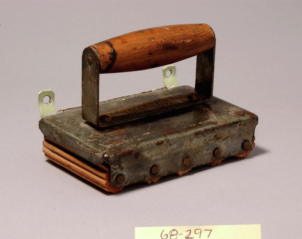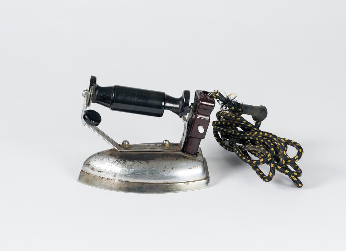 Electric clothes dryer, front loading automatic tumble dryer cabinet, of sheet iron finished in cream enamel paint; on 4 castors. Heating element fitted to inside of door, rotating drum; fluff filter and automatic timer fitted to extreme back of top panel.