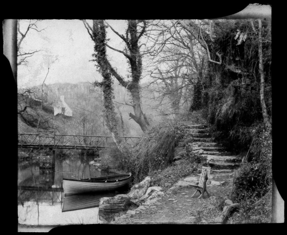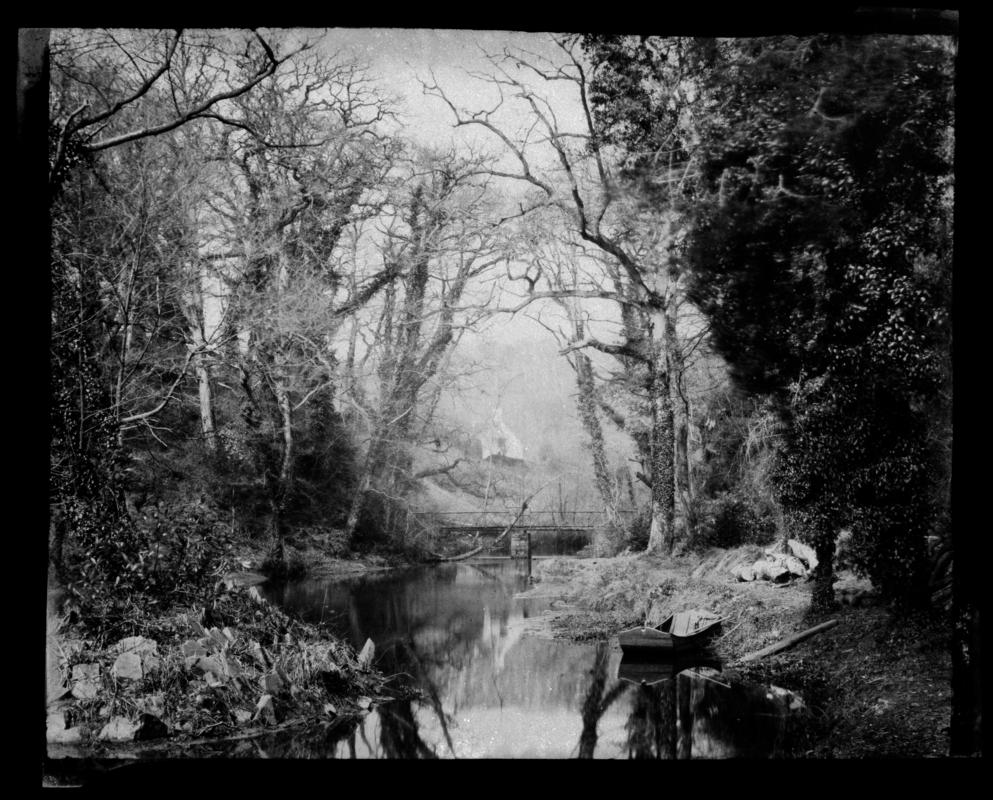 Calotype negative showing rustic bridge over the river as it enters the Upper Lake at Penllergare. Boat and steps at right. Tab at each corner.