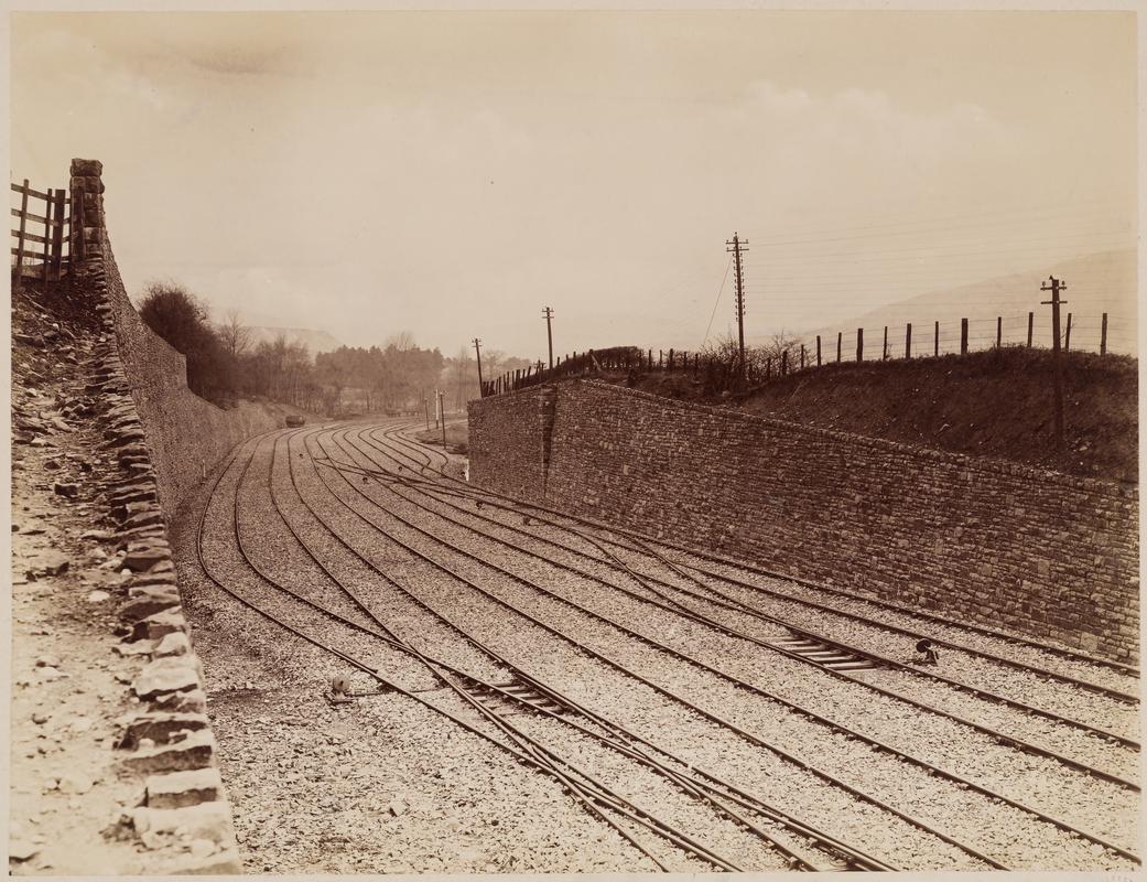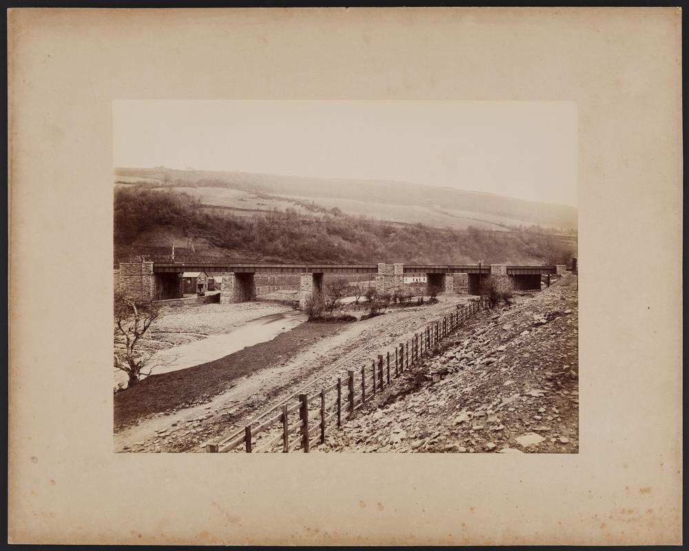 View of the Barry Railway Company’s newly built Pontypridd Viaduct over the valley of Nant Gelli-wion on the south edge of Pontypridd, looking southwest, around winter 1888/89, prior to the line opening to coal traffic in 1889. The headgear of Maritime Colliery can be seen to the south beyond the viaduct. Wagons lettered ‘Maritime’ stand in a siding on the left which connected northwards to the Taff Vale Railway. The curved siding in the right foreground connected to a brickworks located immediately behind the camera position. Maritime Terrace stands on the hillside to the left (south); behind it can be glimpsed the roofs of Maritime Street. Pontypridd old Signal Box on the extreme left (south east) appears to have been very short-lived, probably because its site formed the north west end of the Barry Railway Company’s Pontypridd Station which opened in 1896 (renamed Pontypridd Graig Station by the Great Western Railway in 1924), the station platforms requiring virtually all the available space between the left (south east) side of the viaduct and Pwllgwaun or Pontypridd Tunnel which was immediately beyond the station. The position of Pontypridd new Signal Box that stood just off the right (north west) side of the viaduct from at least 1898 is beyond the edge of the photograph; it probably replaced Pontypridd old Signal Box on the left (south east) of the viaduct when the station was developed in 1896. Photograph mounted on card.