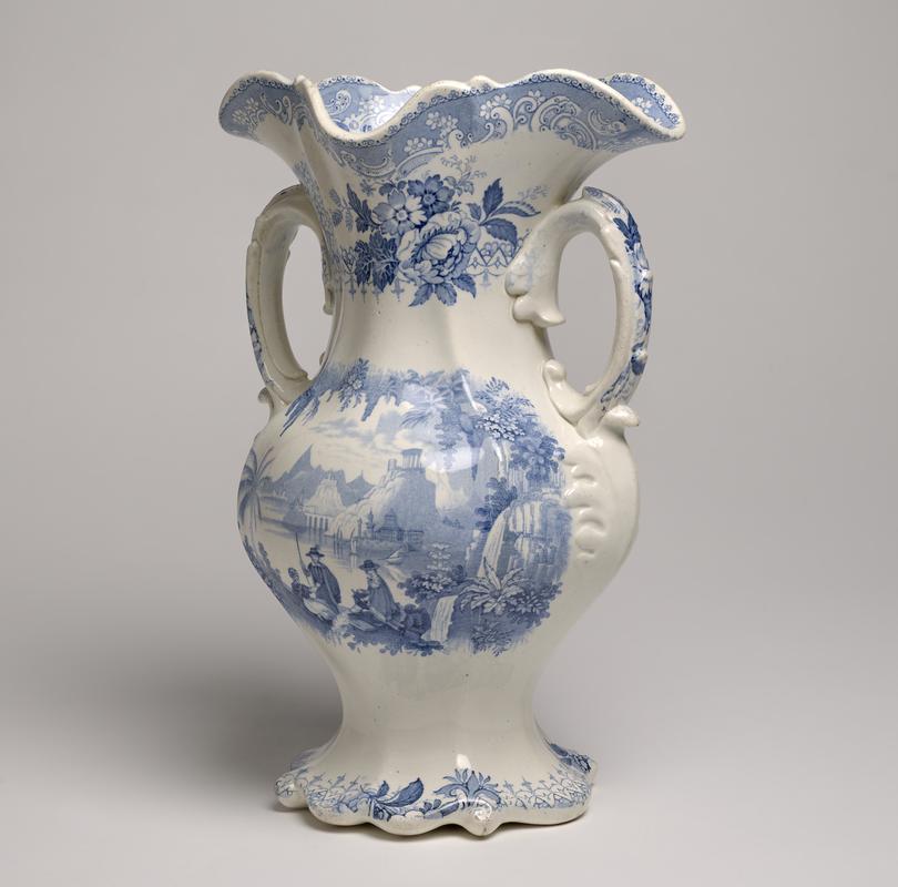 Plate, pearlware, central circular reserve painted in puce with architectural garden gateway and urn, on a brown souffle ground, gilt border on florets and Vs to the rim.