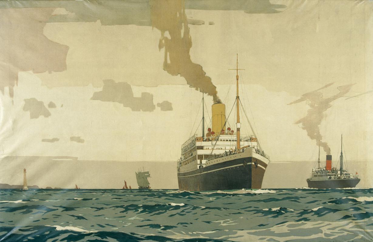 Colour poster showing a map of Great Britain and North coast of France with Midland Railway and general railway routes. Female figure standing on right hand side of print. Paper mounted onto linen background.