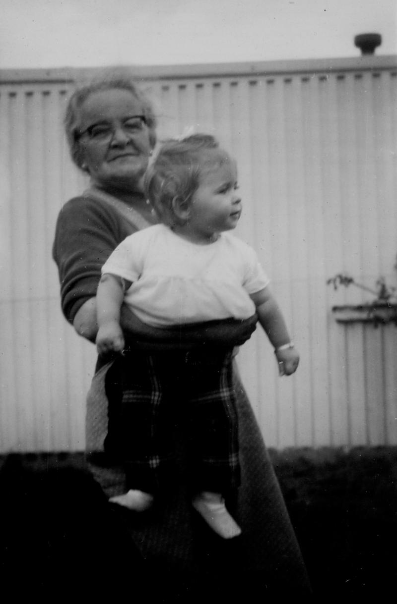 Digital copy of a photograph of Mr Lloyd outside the prefabs at Llandinam Crescent, Gabalfa, Cardiff.