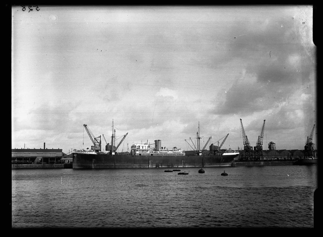 Glass negative of a framed photograph showing Port broadside view of M.V. CORNEL.