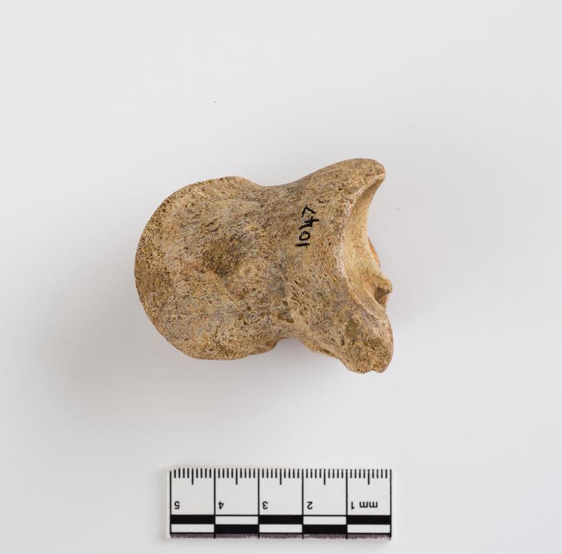 Gnawed bone shaft of a mammoth. Paper labels attached to specimen read 3 and femur of mammoth.