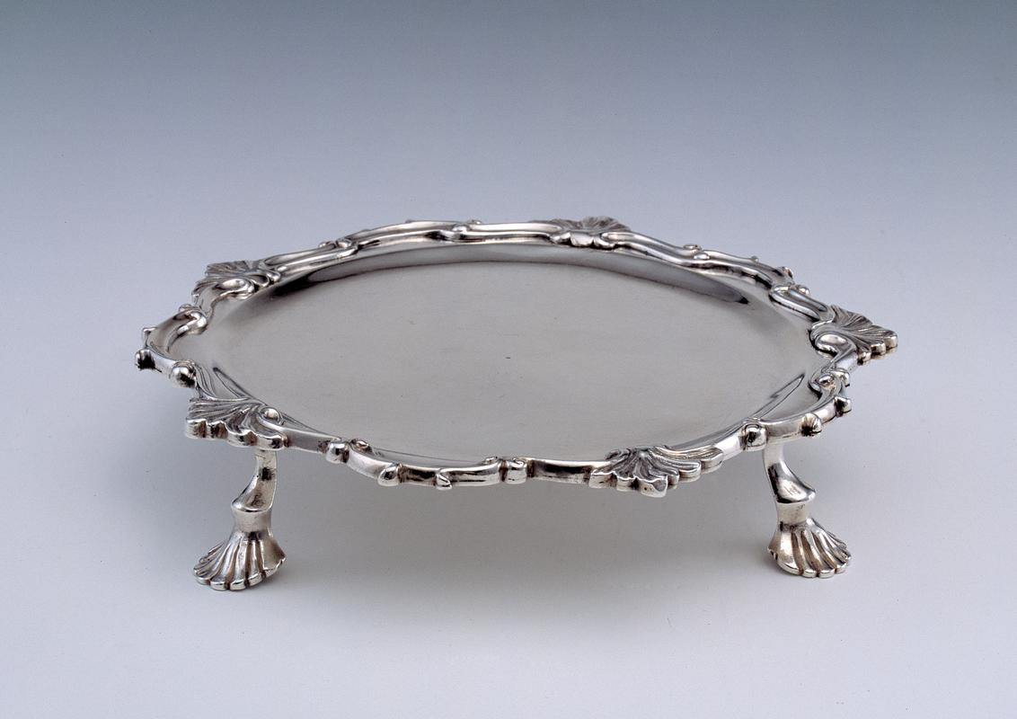 Snuffer, silver, of scissor form with ring handles, shaped snuffer plate and box and pointed end, hinged with a silver pin behind the box; the outer face of the box engraved with an unidentified coat of arms (a lion rampant impaling three scallop shells a chevron between).