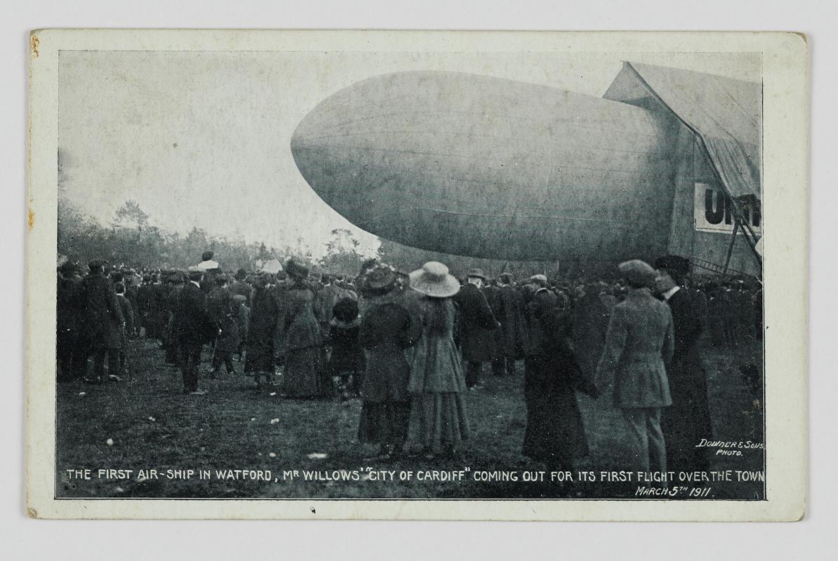 View of airship in air. Postmark dated 'AU. 15 10'.