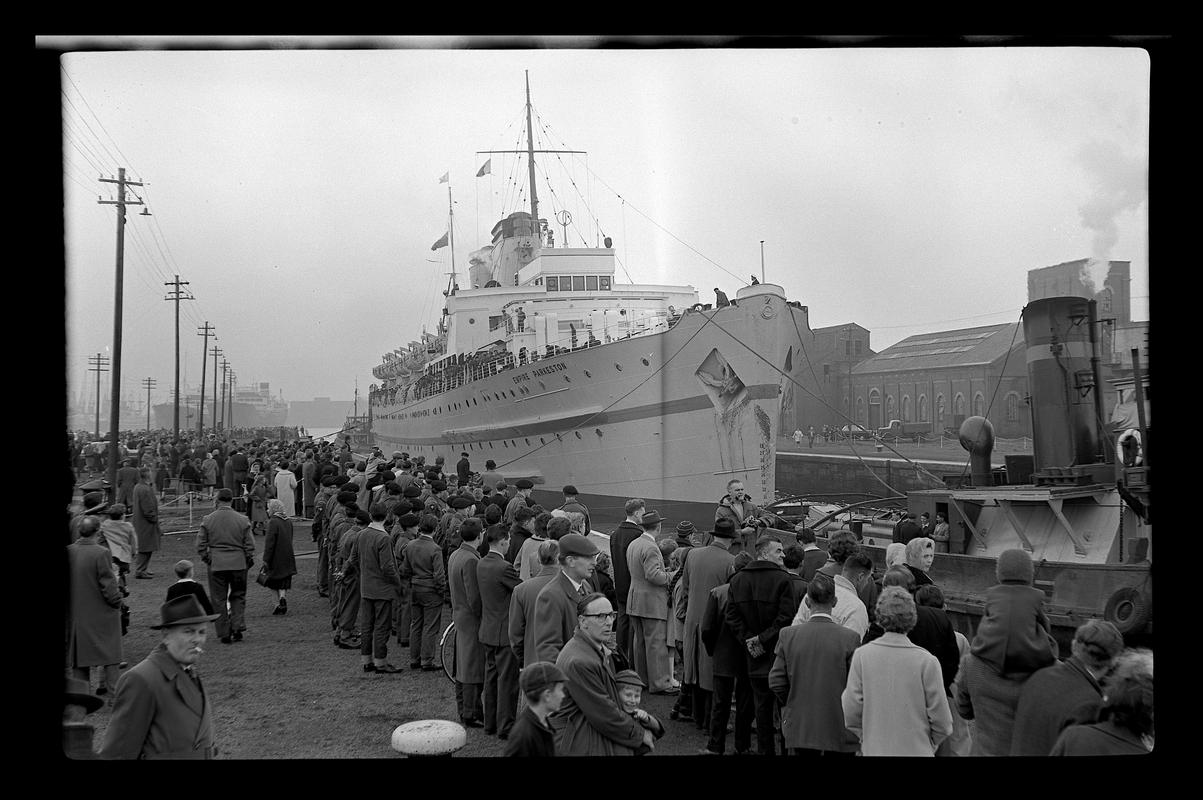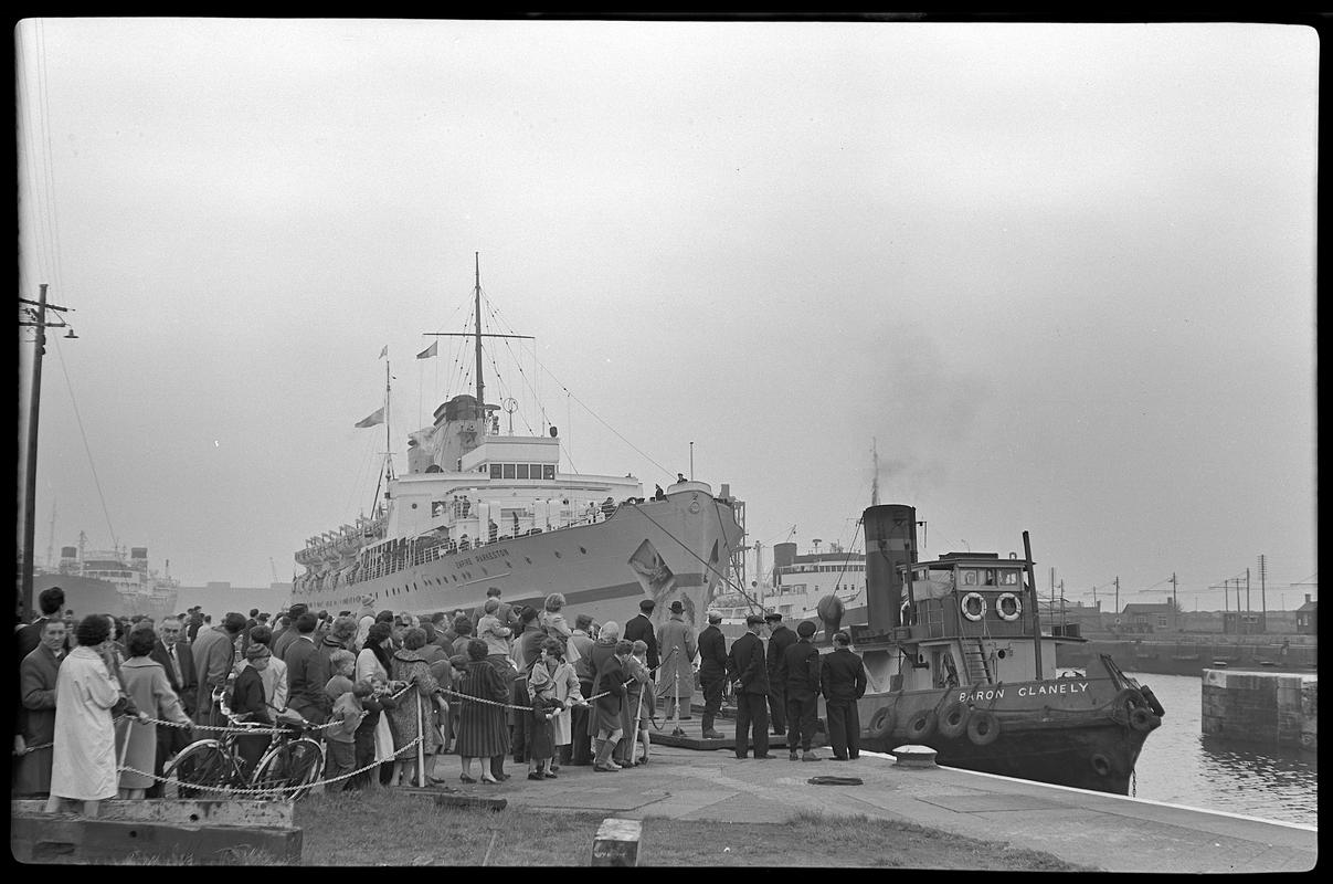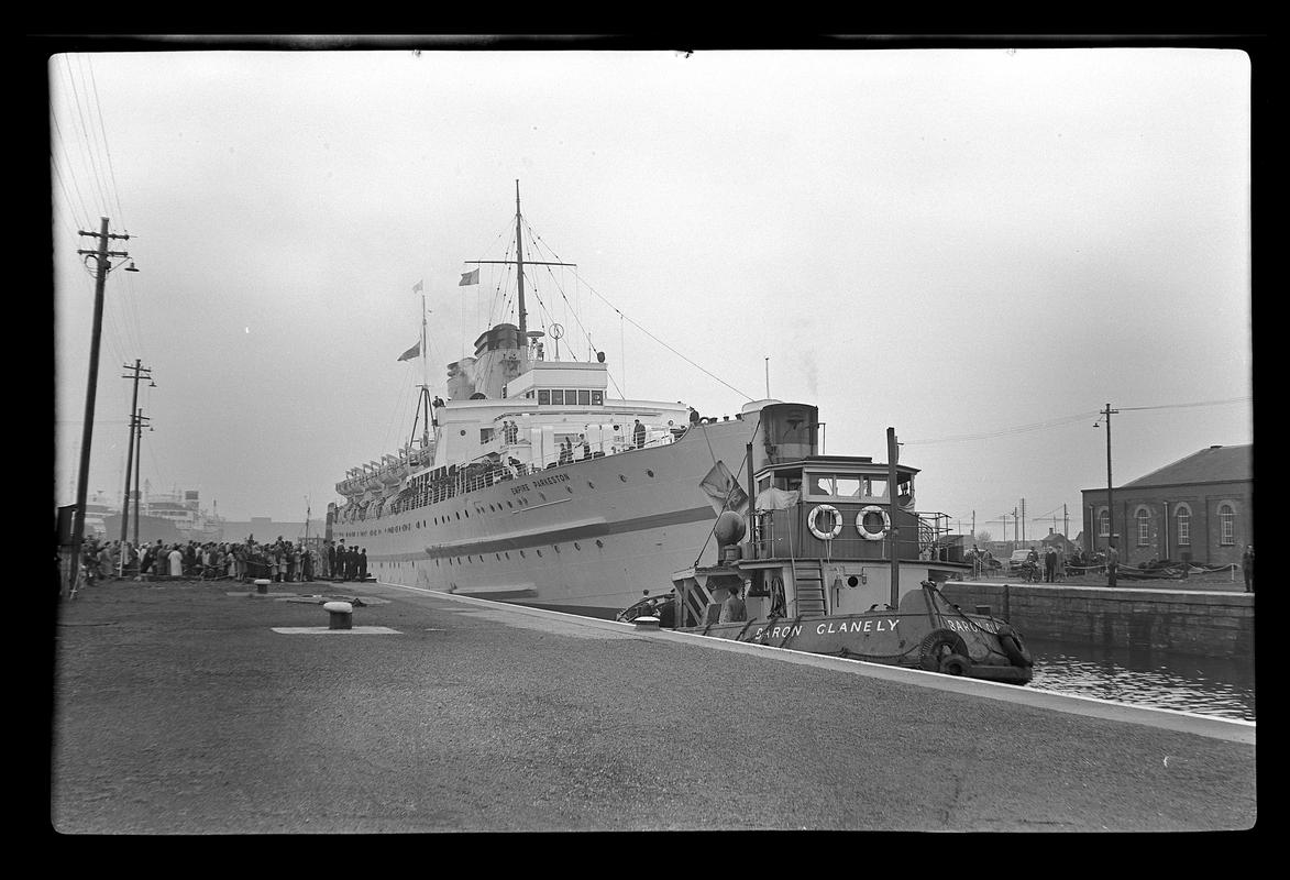 Soldiers of The Welsh Regiment leaving Cardiff aboard the troopship EMPIRE PARKESTON. Ship seen locking out. Ship locking in with tug BARON GLANELY.