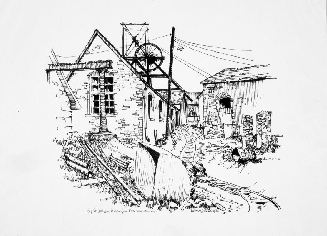 Drawing of the remains of two blast furnaces at Blaenavon Ironworks. Signed and dated at bottom.