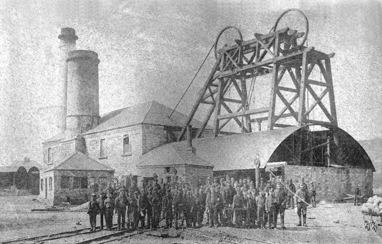 Garn Pit Blaenavon, 21 June 1899. One of the earliest of the Blaenavon pits sunk in the 1830's. Its surface bulk and wooden tandem headframs were typical of the larger pits of this period with a fairly tall engine house containing a vertical steam winding engine. The small and wider chimney probably served as a flue for the underground furnace used for ventilating the mine.
