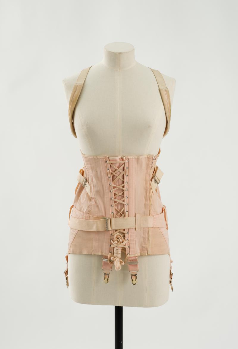 black laced leather surgical boot (right foot) with undyed leather lining, 14 pairs of lace holes and metal ring eyelets (painted black); tab of black cotton twill tape at centre back opening. The inside of the boot is shaped from wood (?) to raise the foot and to give a solid support for when the boot would have been inserted into a 'normal' shoe for wear. The boot doesn't have a sole: the upper leather is simply pulled under the sole area and stitched in place using large blanket stitches. The inner construction of the shoe is visible beyond the edge of the uppers. The upper is constructed from 4 pieces of leather.
