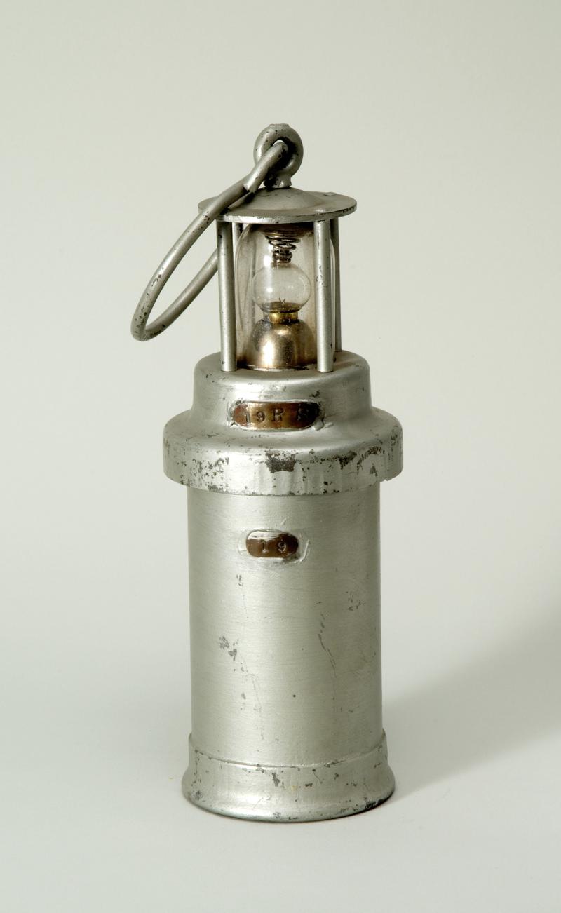Electric hand lamp, CEAG type. Round lamp face set inside the main body of the lamp. Bulb inside the lamp face. Handle at top.