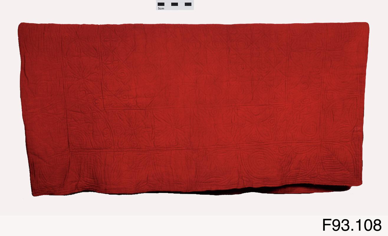 Patchwork quilt, early-to-mid 19th century. Made by a member of donor's family at Aberystwyth or Aberarth. Top cover of pink/brown coloured cotton twill with purple star in centre and smaller stars in each corner. Red wool backing. Carded wool filling.