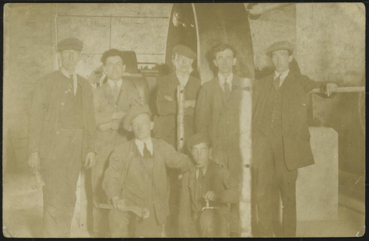 10 chwarelwr (4 o'r rheiny yn fechgyn) yn arddangos y grefft o hollti a naddu llechi. Wedi ei argraffu ar gerdyn post.