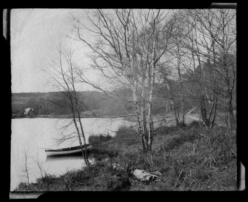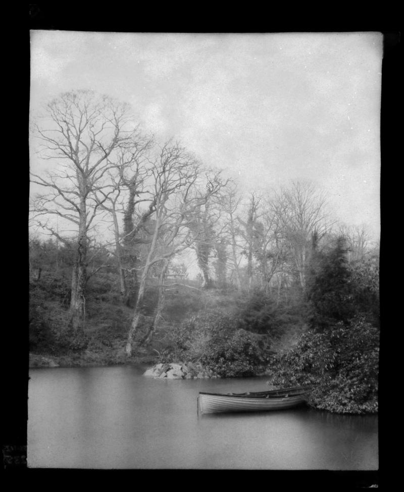 Unwaxed Calotype negative showing the Lower Lake at Penllergare with the boathouse in the distance. Tab at each corner