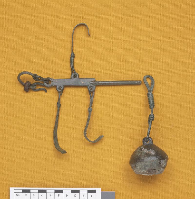 Steelyard with three suspension hooks to provide the different fulcra required to weigh objects of varying weights. All three hooks are made from bronze strips which splay to the hooked ends but narrow to oval-sectioned wire at the other ends; this passes through the loops on the steelyard and are secured by being twisted back around themselves. From the looped terminal of the steelyard hangs a W of wire which secures a semioval of wire through its pierced ends. A fragment of an iron ring is attached to this fitting. The facetted face has groups of six dots divided by transverse lines. Another has more widely spaced dots. A third face has two dots 21 mm apart and on a fourth only a single dot survives. Unfortunately the steelyard is incomplete and it is impossible to tell whether each groove represents a pound (327.45g) and each dot an ounce (27.29g) as on the Colchester example (Crummy 1983, No 2508). However one face has groups of six dots divided by transverse lines, so it is likely that each group represented six ounces or a semis. The dots are not carefully placed suggesting that the resultant measurements would not be scientifically accurate. One other face has more-widely-spaced dots but no complete group survives to indicate the weights involved. Condition: shank broken off, one hook broken in two.