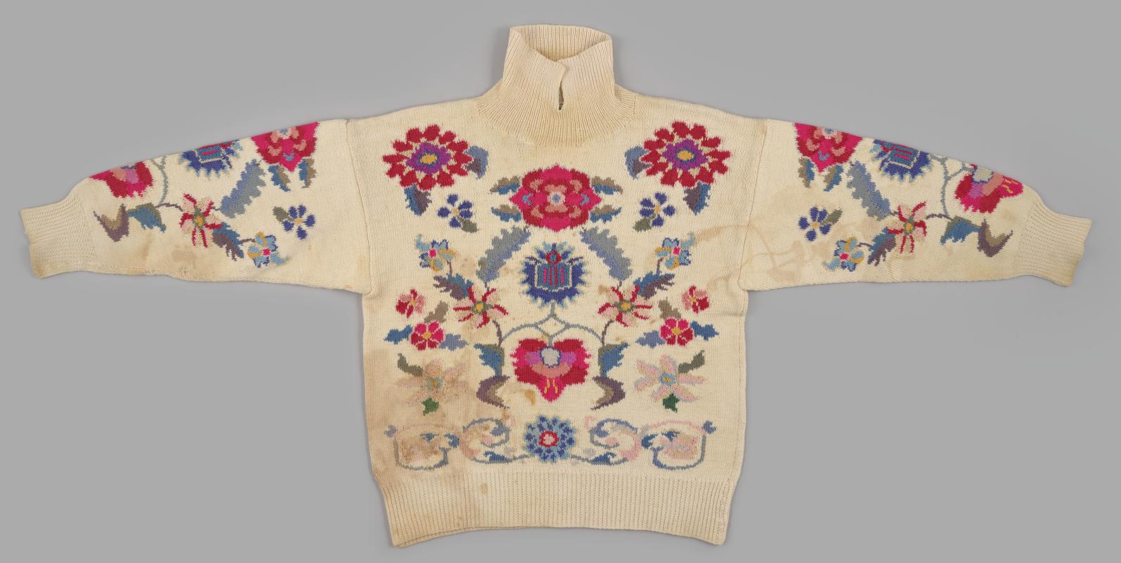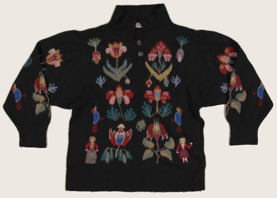 'Fars' sweater designed by Jamie & Jessi Seaton. Hand-knitted in wool using the intarsia technique. Pattern published in Sweaters from the Seaton Collection (1989) and The Seaton Collection: Exclusive Knitting Designs (1989). Black with stylised human, animal and plant designs on front, back and sleeves.