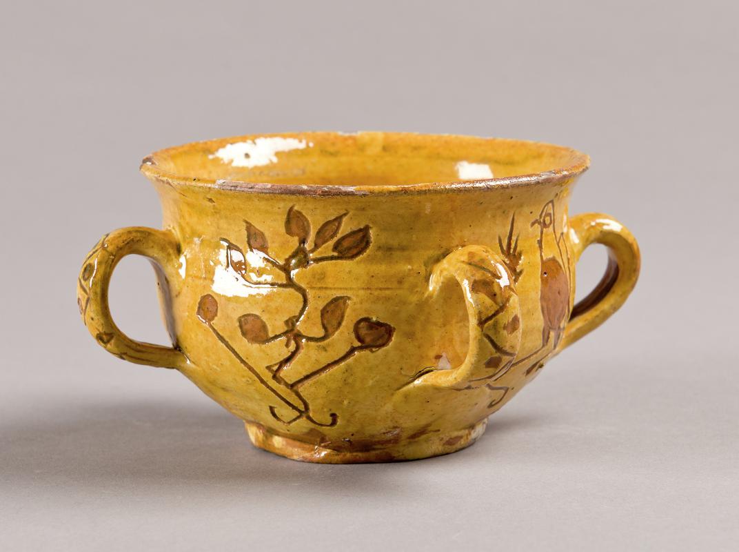 In style of wassail bowl. Hard reddish grey fabric, white slipped and with some trailed slip decoration. Yellow glaze producing light brown & yellow effect. Surmounted by a cockerel faced by a barking dog. Loop handles, originally with bird figures, one of which remains. Sgraffito inscriptions.