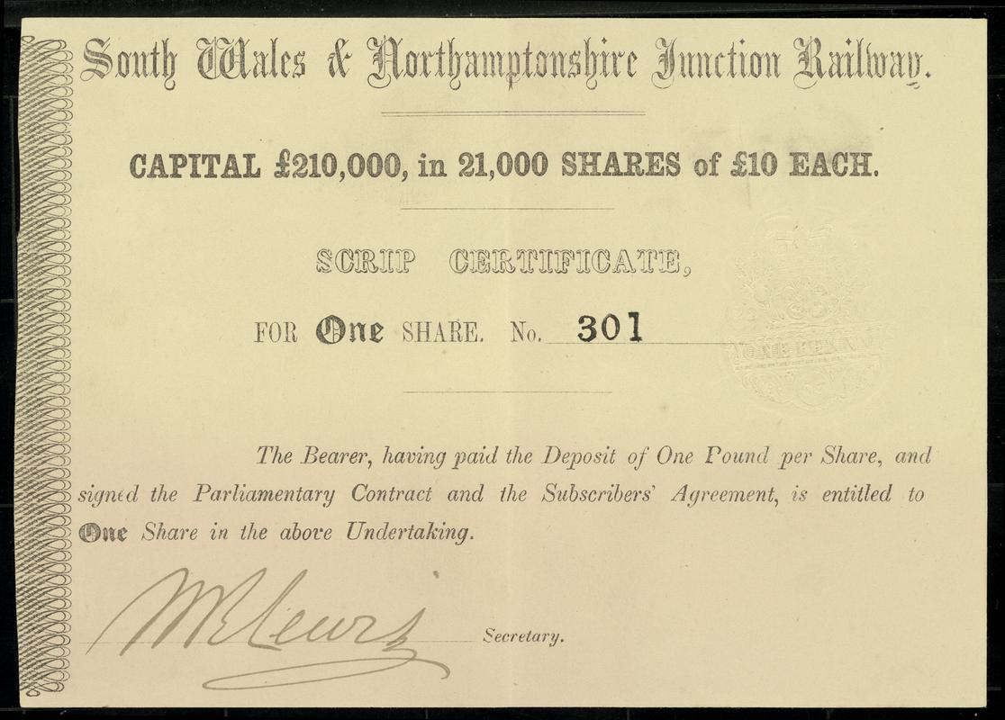 Full title - Cambrian & Grand Junction Railway, connecting South Wales with Birmingham, Liverpool, Manchester, and the North (Registered Provisionally). Capital:- £2,200,000, in 110,000 Shares of £20 each. Deposit:- £2.2s. per Share. Share prospectus dated September 1845, contains application form. Folded.