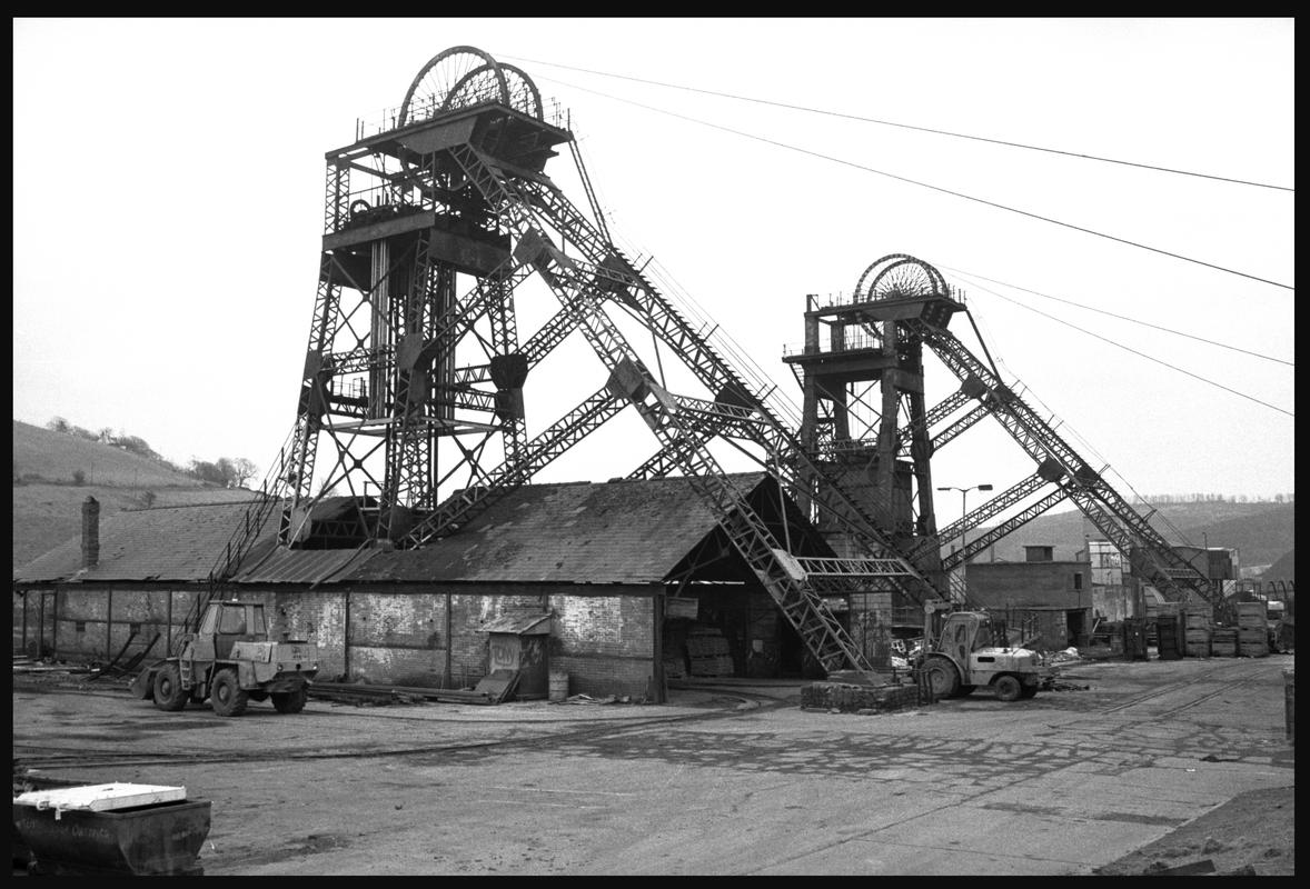 Surface view showing headgear and surrounding buildings, Maerdy Colliery.