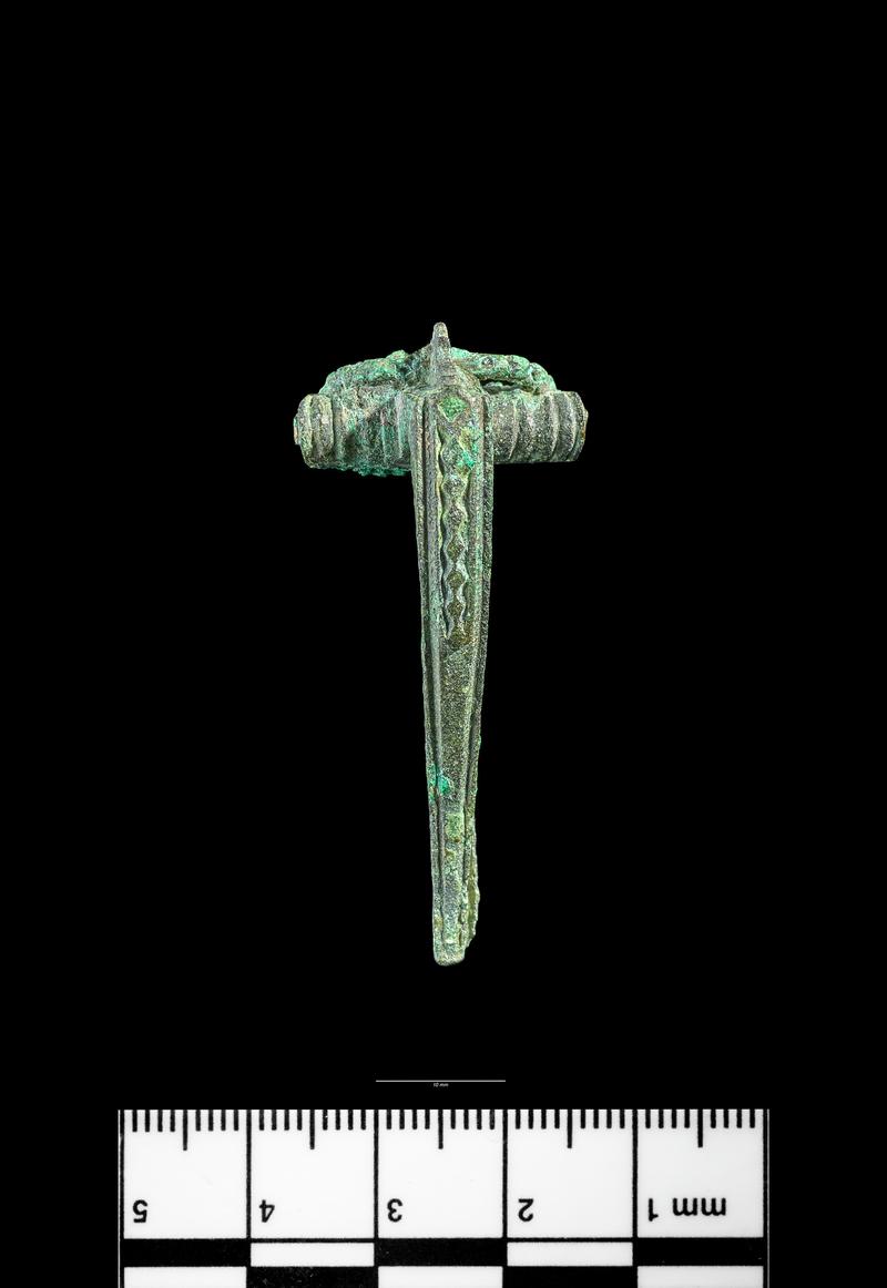 Part of a copper alloy brooch of Polden Hill type with sidwings decorated by a hatched band along its outer edge. A ridge runs down the bow from the chord hook and the circular plates on either side are decorated with short incised lines around their edge. Most of the bow and the foot are missing. Brooches of Polden Hill from have been found at Whitton (Jarrett and Wrathmell 1981) and Usk (Manning 1993, p78-80, fig. 25).