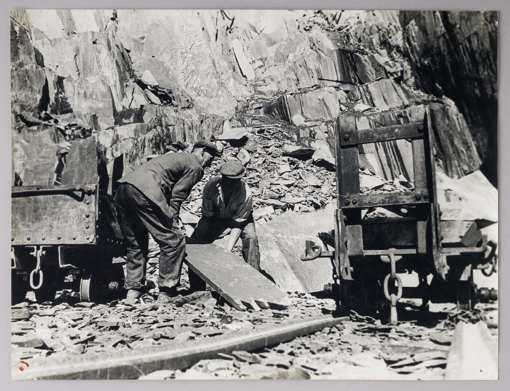 Golygfa o waelod inclein C1, Chwarel Dinorwig yn dangos dau ddyn gyda wagen yn llawn llechi yn cael ei gludo lawr inclein . Mae’r ffotograff wedi ei dynnu o lefel Sinc Fawr, ac yn edrych tua’r gorllewin tuag at seidins Hafod Owen.