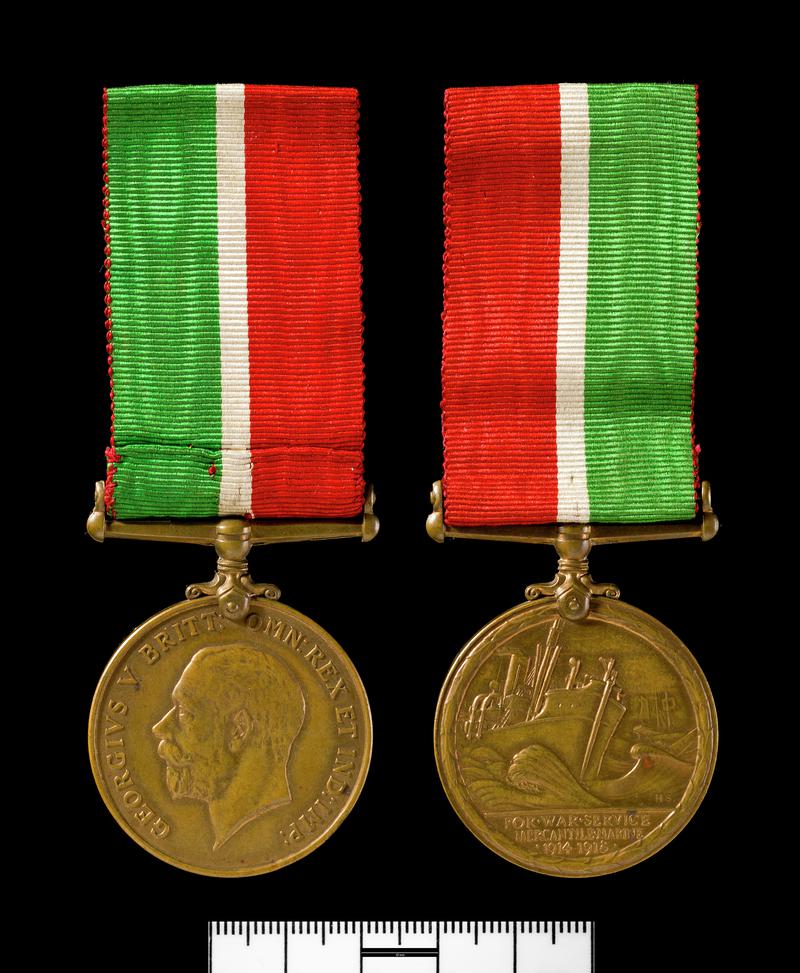 Medal Ryfel y Llynges Fasnachol 1914-1918. Cyflwynwyd i Ivor G. J. Sparks.