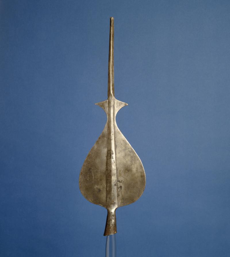 Silver strap-end with incised zoomoorphic designs, set against a niello background. The sides are of slightly convex form and the border is notched to form a coarsly beaded band. The split attachment end has two circular rivet holes (one retaining a rivet), below which is a centrally placed, incised, trilobate palmette motif. There is a main centrally placed panel of two intertwined sinuous creatures with forelegs, heads in profile with single ears and dots for eyes, whose bodies have devolved into ribbon-like interlace. Each beast bites the body of the other. The strap-end terminates in a stylised animal head with circular ears; incisions around raised dots represent the eyes; there is a disjointed, stylized trilobate palmette motif on the brow. The back is plain. The strap-end reflects an abstract aspect of the Trewhiddle style of Anglo-Saxon ornamental metalwork of the second half of the ninth century. The surfaces show evidence of wear, and modern polishing.