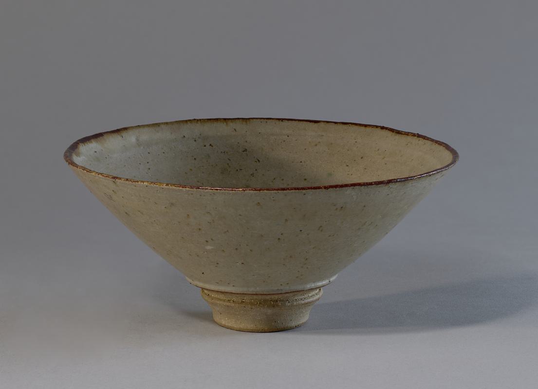 Tall plain coiled bowl, deep red/brown colour, heavy and narrow at base tapering outwards to fine thin rim. Unglazed smooth surface, covered with shallow scratches from metal kidney.