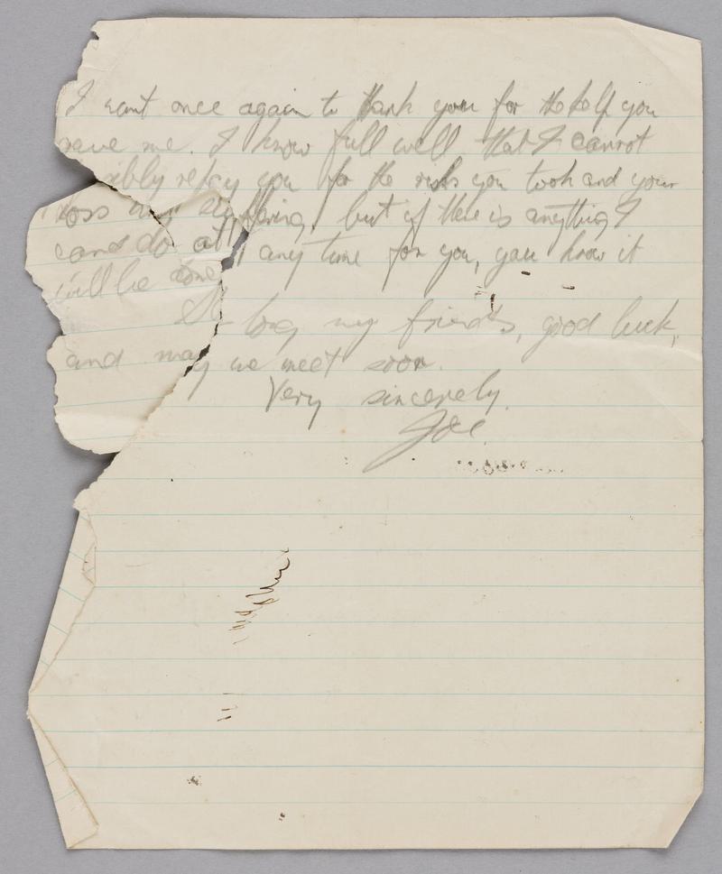 Part of a collection of items belonging to Cecil (Joe) Rees. Cecil (Joe) Rees was a member of the RAF and took part in several bombing raids during the Second World War. His plane was shot down in May 1943 on the way back from a raid on Wuppertal, Germany. While sheltering with a Flemish family, Cecil was captured by the Germans and sent to the prisoner of war camp, Stalag Luft 3. However he managed to escape but was recaptured by the Germans and sent back to the camp.