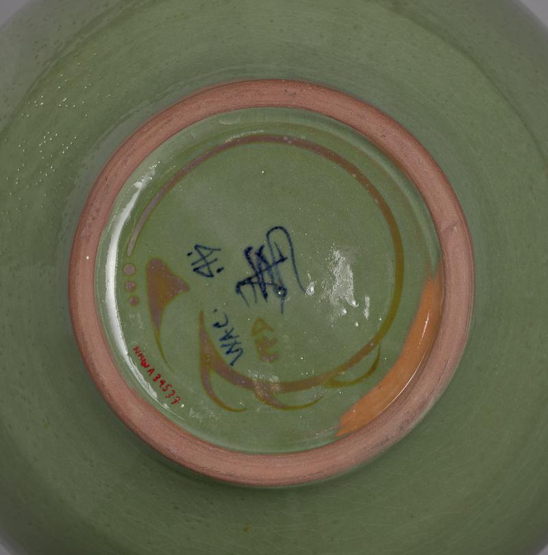 Large bowl, red earthenware, round foot rim, rounded sides flaring out at the rim; decorated with deep pink and reddish-green lustre design applied with a brush on pale pink tin-glazed background, abstract design with central star, from which radiate branch-like forms, infilled brush decoration of swags that increase in size towards the rim of the bowl, the rim is decorated with elongated hexagonal forms.