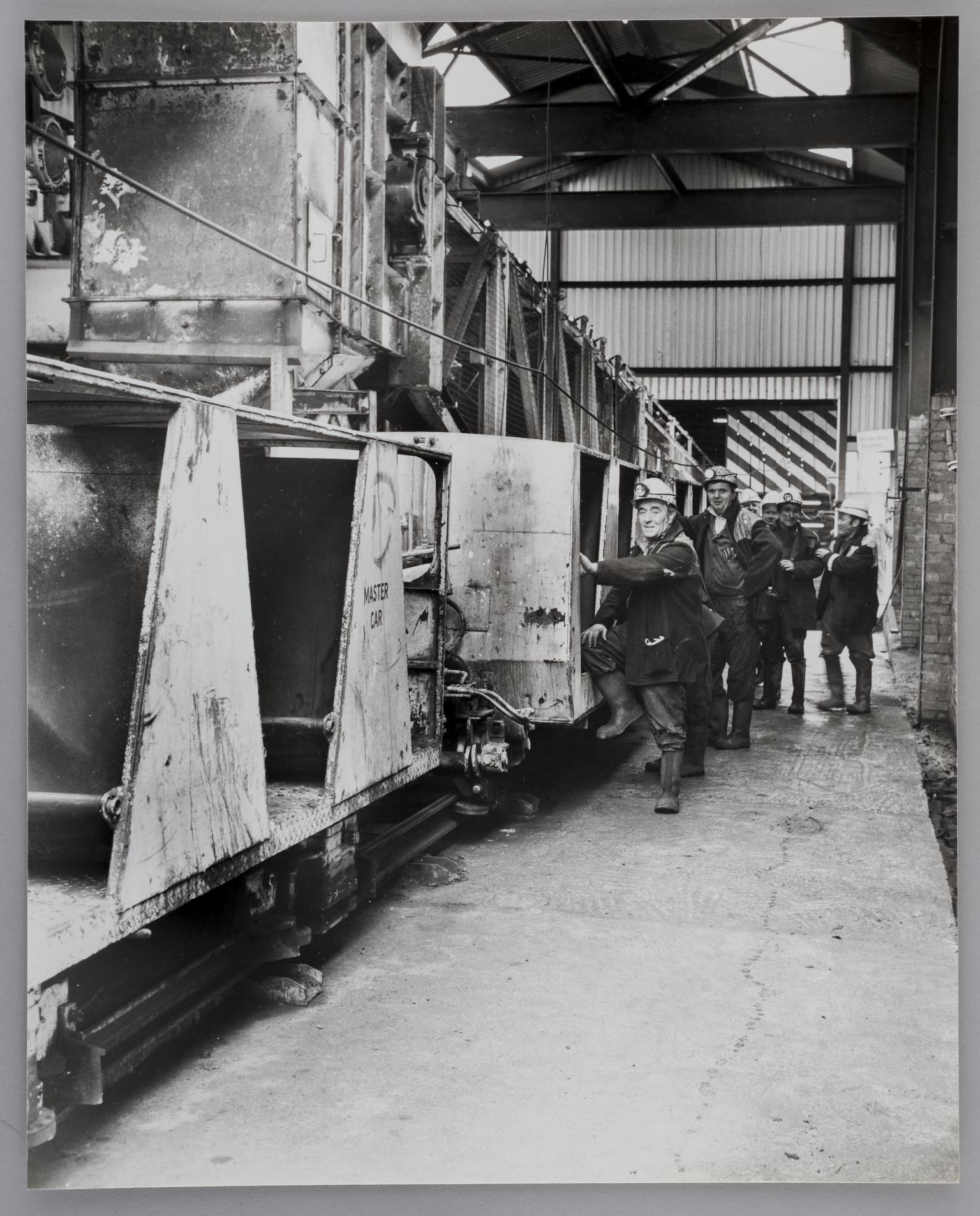Afternoon shift boarding the manriding train, Blaenant Colliery, late 1970s.