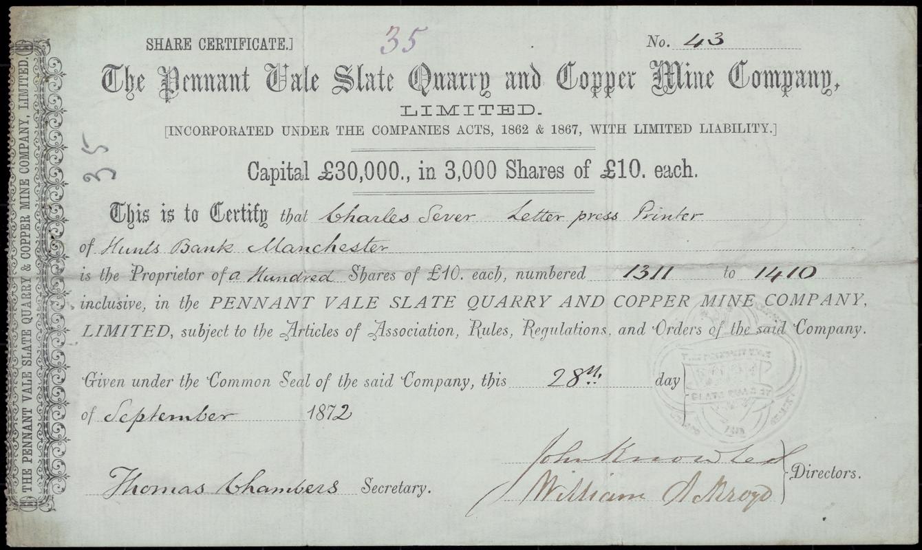 Welsh Mineral Company Limited, £10 "A" shares, 1876, black on green. * Black print on green paper with handwritten details completed in black ink and large "A" printed in white in centre. Ornate border on left only. Embossed company seal on lower left hand corner with embossed image of Prince of Wales's feathers in centre. 18 £10 shares numbered 51 to 68. Dated 4 August 1876.