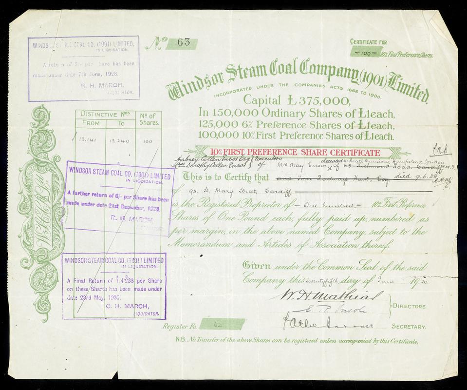 Windsor Steam Coal Co. (1901) Ltd., share cert