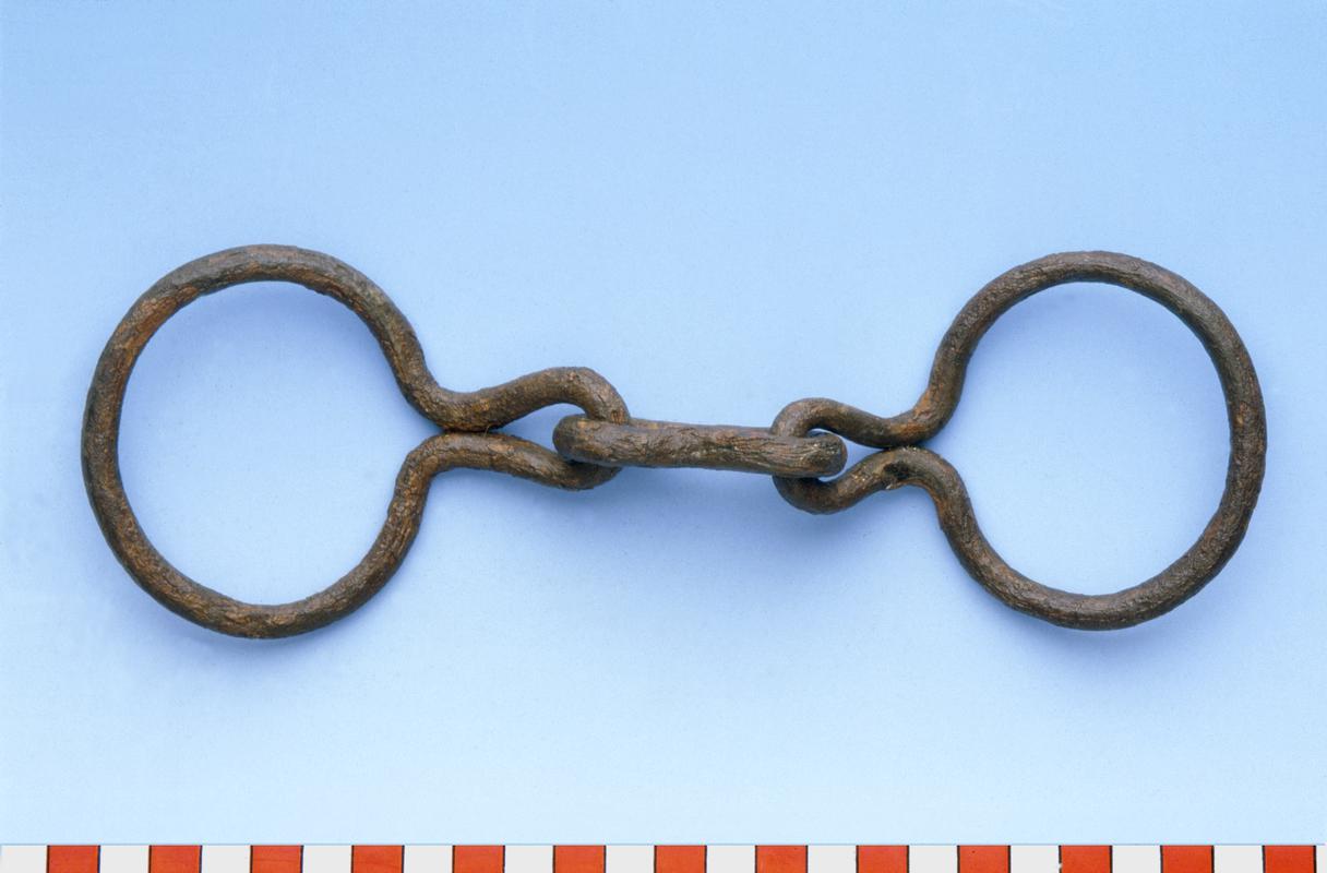 Iron rein-ring and side-link both plated with copper alloy. The rein-ring is slightly oval (external diameter 77-81mm, internal diameter 59-63m) and circular in cross-section (diameter c.9mm). Two flattened stop-studs (diameter c.14mm, height 8mm) are fixed through the ring by iron rivets. There are wear facets on the link side of both stop-studs. The portion of the ring which accommodated the side-link is also partially worn through but this was originally thinner than the main part of the rein-ring. The perforations of the segmented side-link (length 69mm, width of terminal bulb socket 17mm) are set in perpendicular planes at right angles to one another. The inner eye of the side-link has worn through.