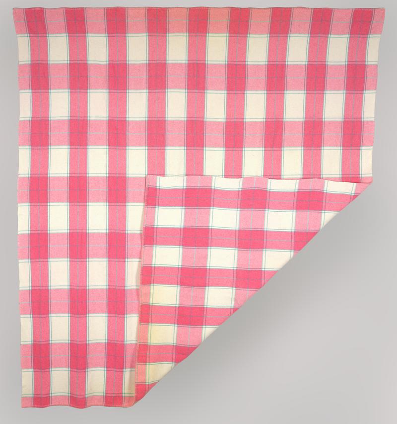 A blanket woven at Cambrian Mills, Dre-fach Felindre, about 1930s. Large light blue check, navy, black and orange colours on a cream base. It has been cut and the edge foldedm and stitched with blue wool fringed at the top. Previously owned by the donor's grandfather of Ivy House, Dre-fach Felindre.