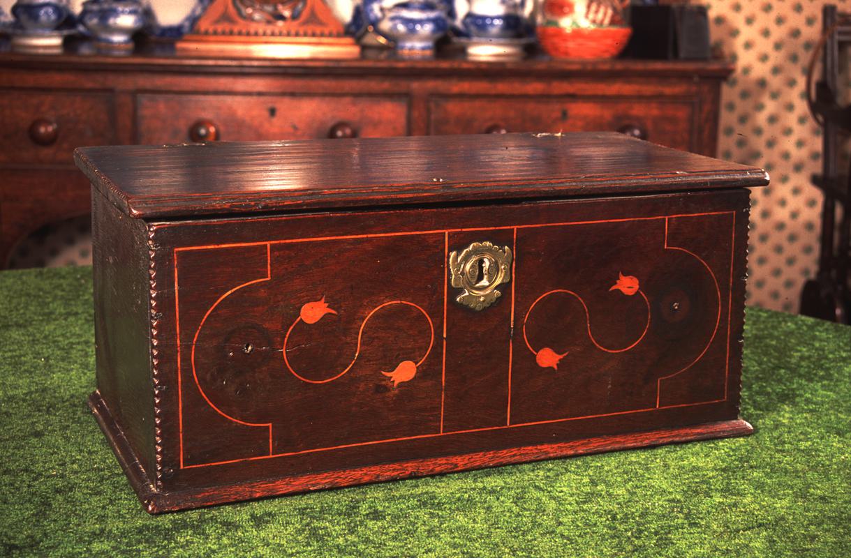 An oak box with wire hinged lid. Solid oak plank construction. The front has spiral carvings at sides and bottom. Beneath the iron lock are the initials I W and the date 1707. Belonged to family of donor's father, Red. Rees David Rees (b. Velindre 1874), Vicar of Cilcennin, Cardiganshire and Llangathen, Carmarthenshire.