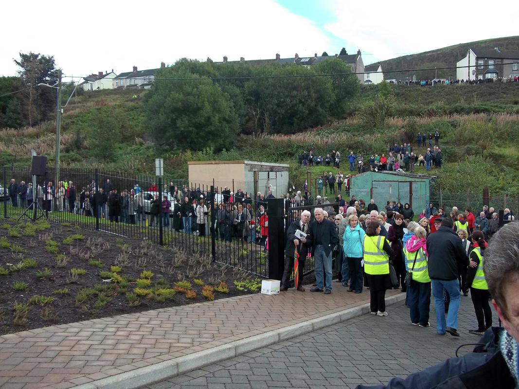 Timetable of Morning Dedication Service and programme for Evening Performance for the Dedication of the Welsh National Mining Memorial on Monday 14th October 2013. Black, orange and yellow print on white paper.