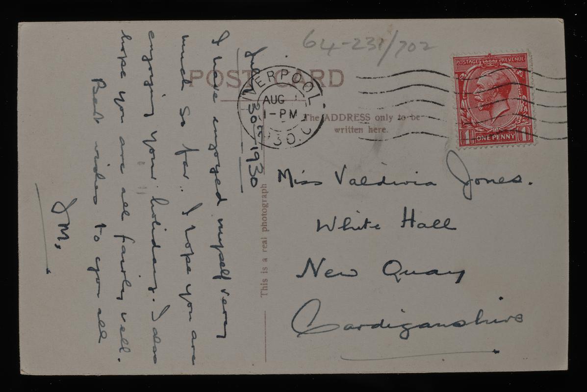 Postcard of "North Gate, Totnes" at night. Sent to Master Tom. Madoc Jones of Bodwrog. Postmarked 29 December 1905.