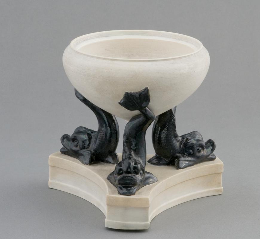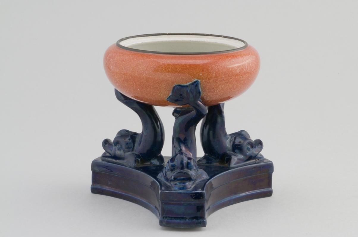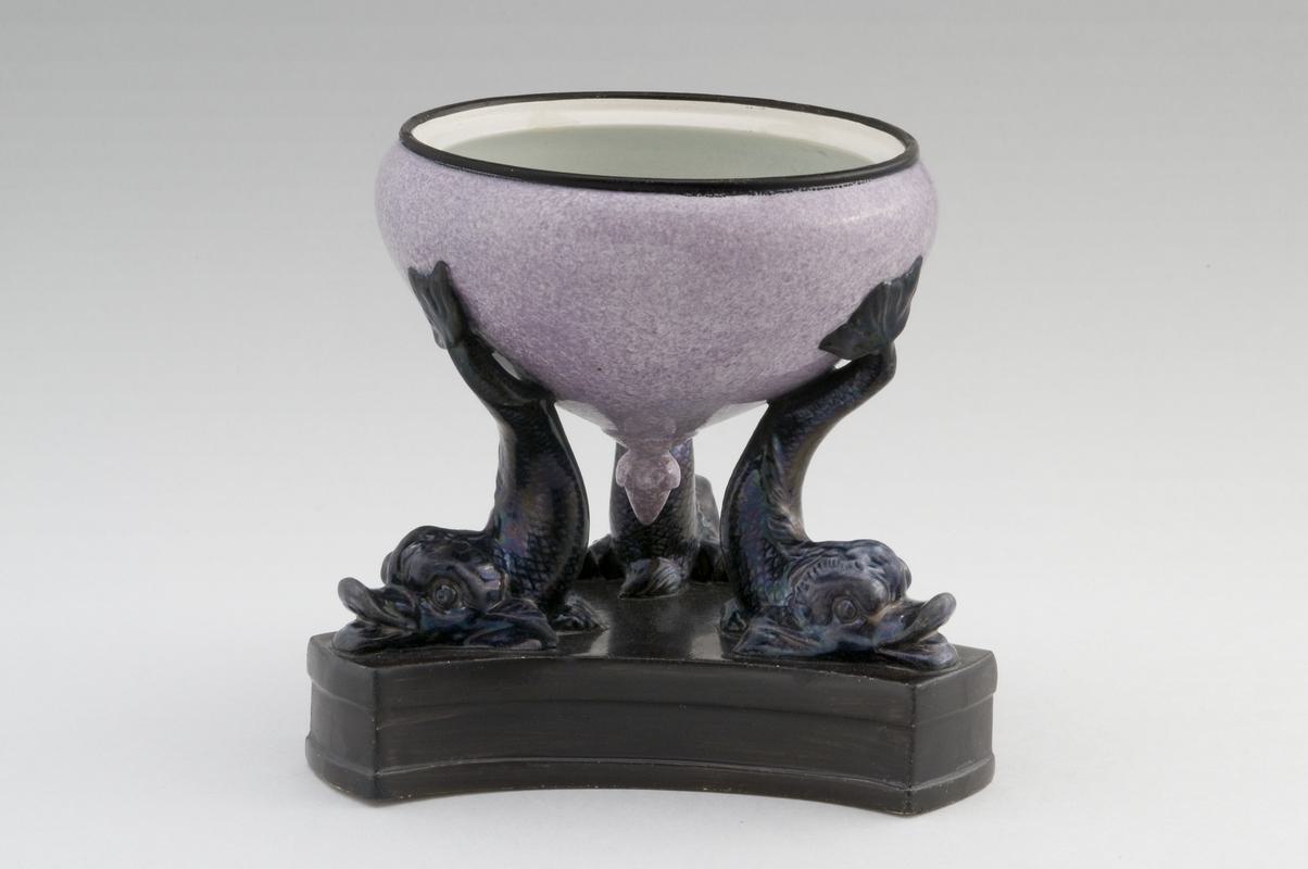 Vase, cover missing, tripod form: triangular foot with concave sides and chamfered points, and relief band along upper and lower edge; stem of vase formed of three separate dolphins, one placed on each corner each with its body curving upwards to support wheel-thrown bowl, hemi-ovoid, with central pendant boss formed of a reversed acorn finial, inverted at shoulder, flanged rim. Underside of foot unglazed, upper enamelled black, body shaded from black to dark purplish/blue, inside bowl cream-glazed. Rim chipped.
