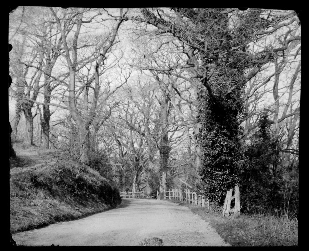 Unwaxed calotype negative with three tabs. Ivy covered trees in woodland at Penllergare.
