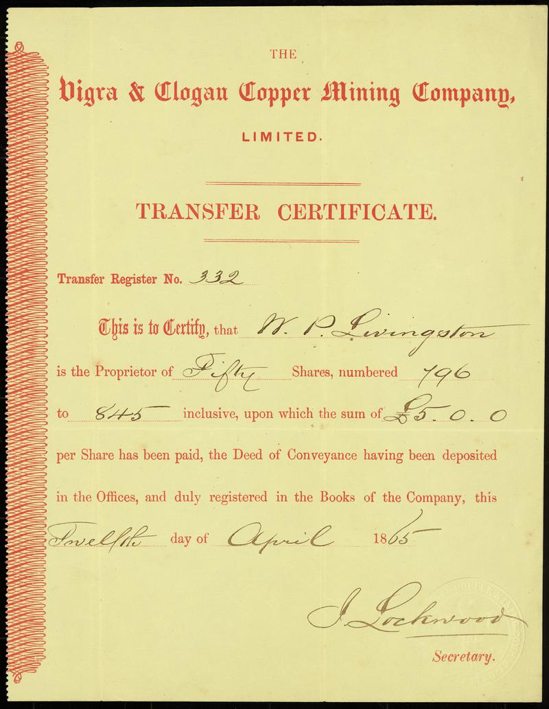 The East Clogau Gold Mining Company Limited, £1 ordinary shares, 1862, navy on white. * Navy, red and black print on white paper. Ornate border on left only. Embossed company seal on lower right hand corner. 5 £1 shares numbered 42831 to 42835. Dated 21 April 1862.