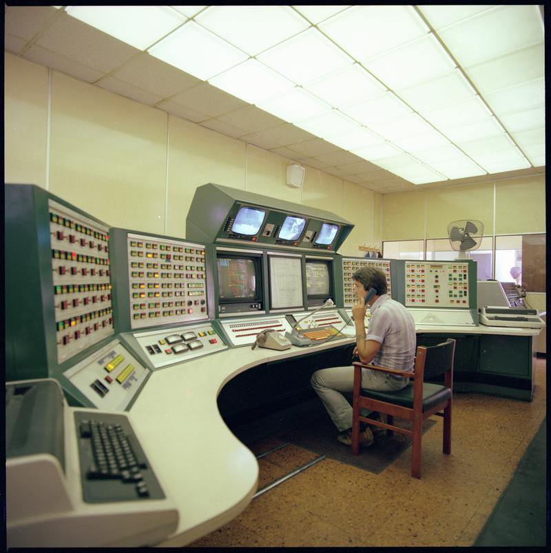 Black and white film negative showing a level and furnace stack, Trehafod, March 1980. 'Level and furnace stack, Trehafod 3/80' is transcribed from original negative bag.
