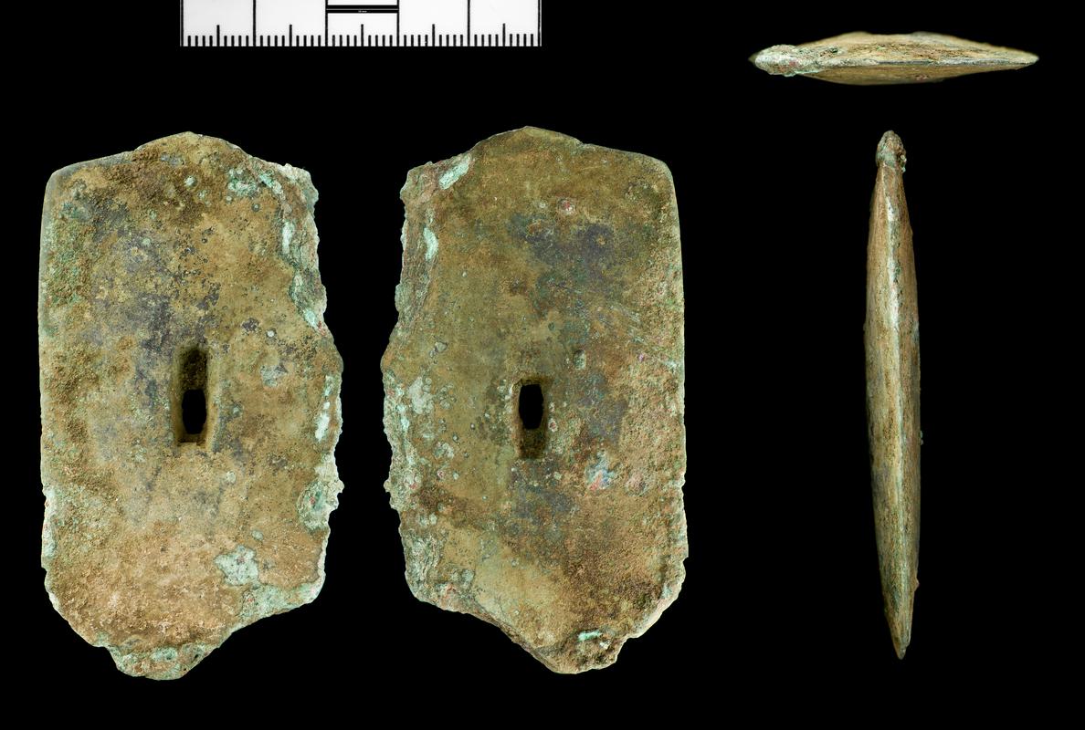 Lanceolate shaped pegged spearhead with incomplete socket below peg-holes. The blade has a pronounced central rib, which tapers markedly at the lower blade, rather than tapering evenly along the blade. The socket is slightly sub-angular at top, base and sides, giving a socket cross-section which is not perfectly circular and has very slight angles. The blade has bevelled edges and at the widest point of the blade, the wing to bevel outline appears to have a slight change of angle, from a continuous convex curve, however there is no break in the slightly convex curve of the upper blade. The spearhead is of medium length, with blade wings of modest width, but marked thickness. The casting seam on the socket is visible but has been carefully filed or hammered down. The peg-holes appear to be near circular, although only part of their diameters survive, as the socket and mouth end has been broken away across the peg-holes. On the blade wings and bevels, striations parallel with the rib and blade edges are evident, suggesting sharpening and preparing for use. The spearhead appears slightly bent in side-section, suggesting impact during use or retrieval from the ground. The artefact has a grey-green patina, with pale powdery green, tip, edges and at the socket break. On the lower blade surfaces there are patches of green and blue concretions.