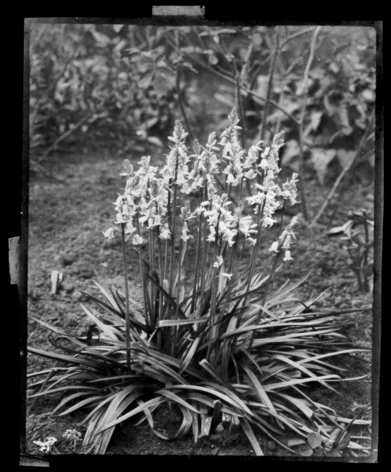 Salted paper print. Close up of bluebell. Photograph cut into an oval shape.
