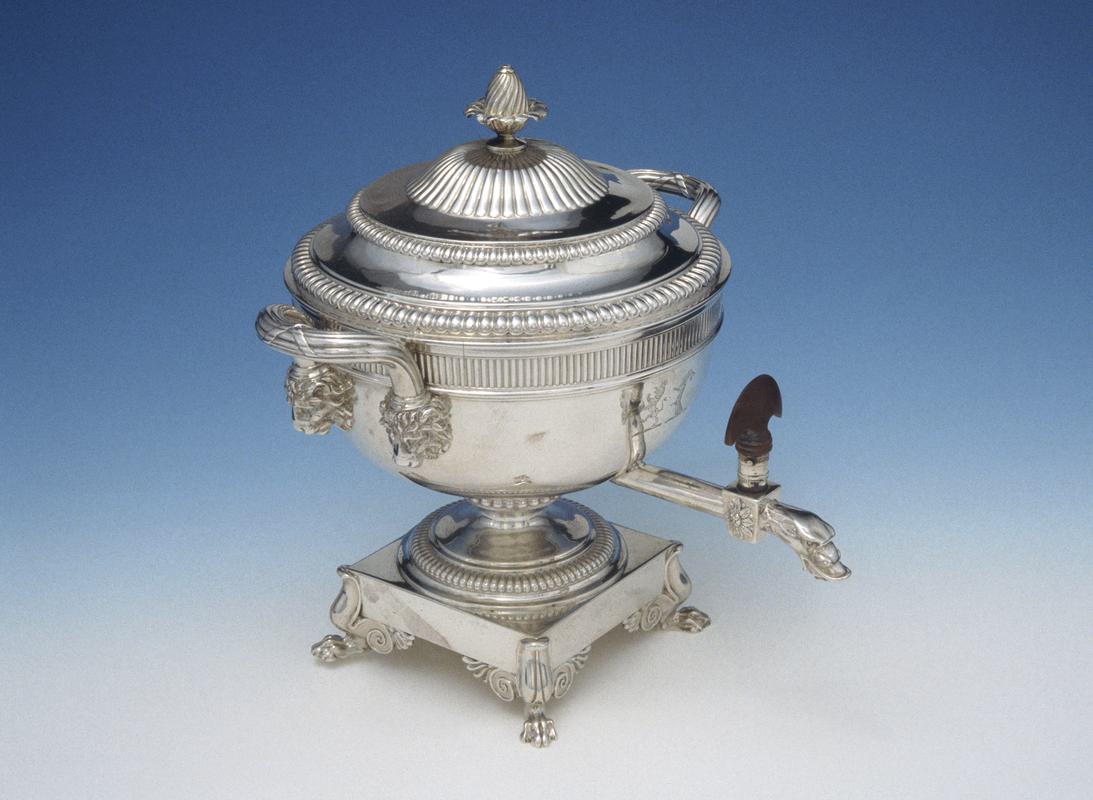 Baluster shaped urn, with handle either side in the form of a scrolling vine. Square base with pierced decoration, on four pierced bracket feet. Lower part of body with tap. Steep lid, with acorn finial. Whole covered in crimson japan, painted in colours with birds, fruit and flowers