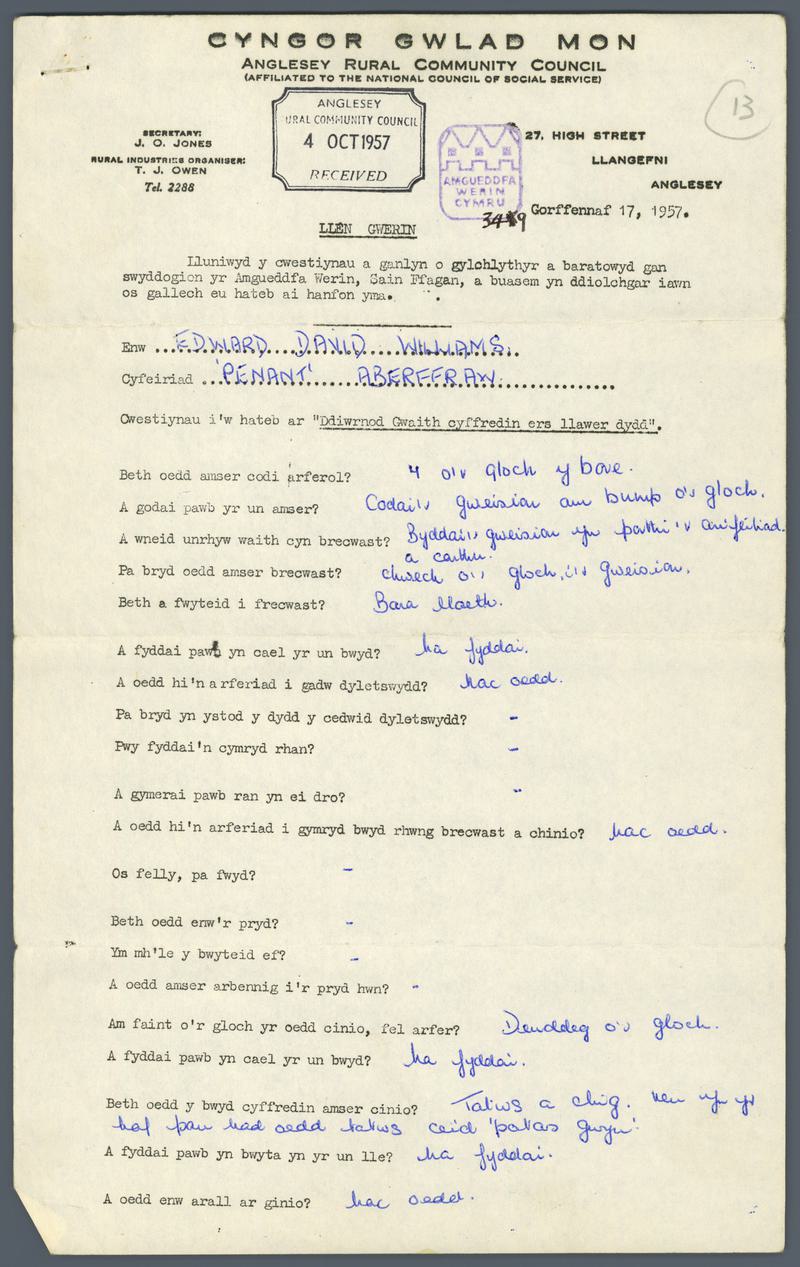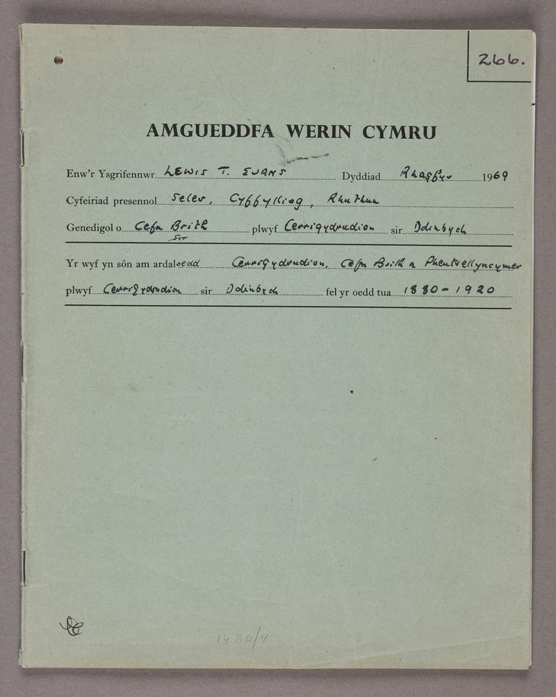 Nodiadau teipiedig gan Lewis Williams, Treharris, tua 1962, yn ateb i Holiadur Amgueddfa Werin Cymru ar arferion yn gysylltiedig â marw a chladdu yn ardal Corris tua 1894.