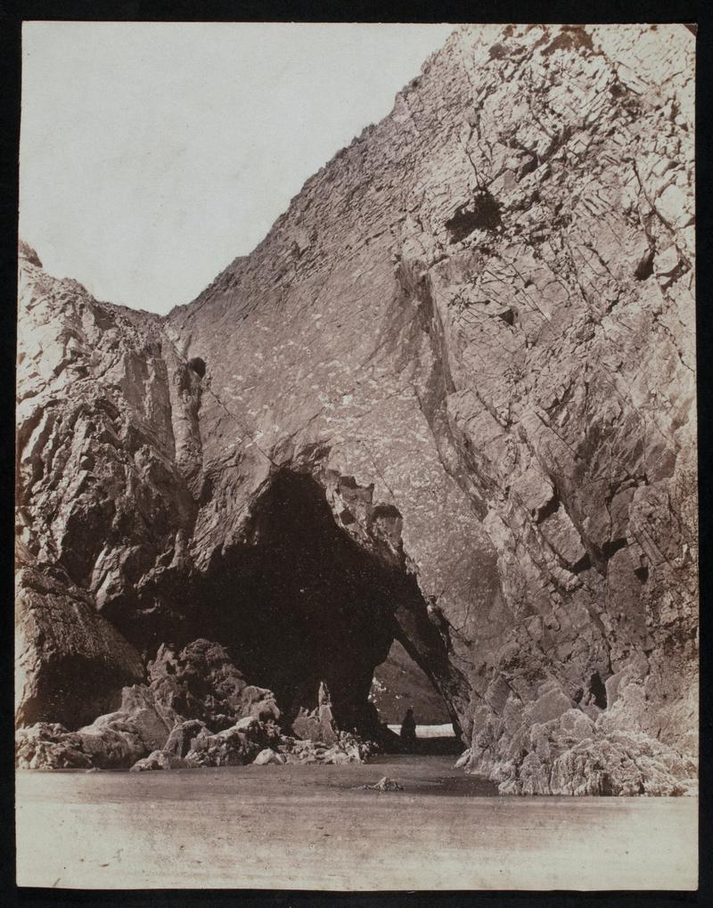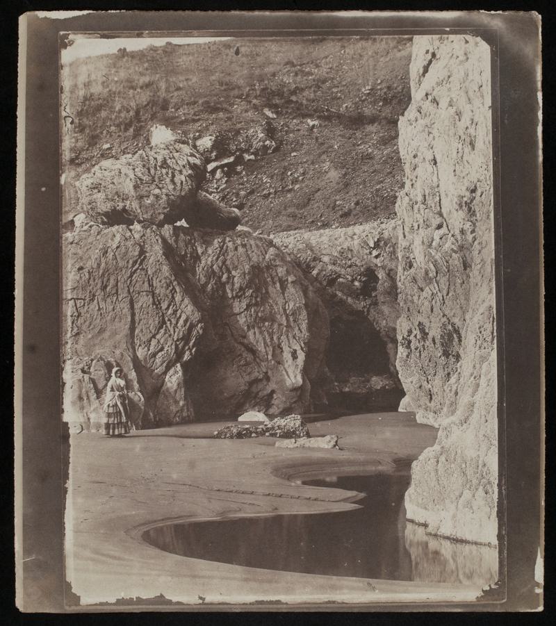 Collodion glass negative showing female figure (probably a relative of John Dillwyn Llewelyn) standing in Three Cliffs Bay. Cliffs in background with rock pool in foreground.