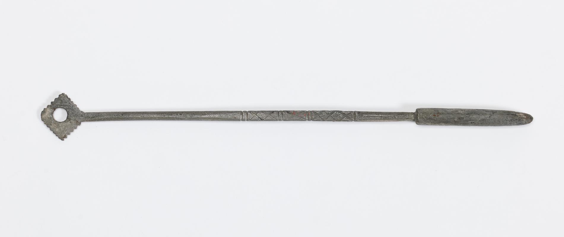 Mangle type, fixed to a cast iron stand, pierced for fixing on table or base. Two grooved brass rollers, hollow to receive hot irons and operated by a bone-grip handle. Complete with two heating irons.