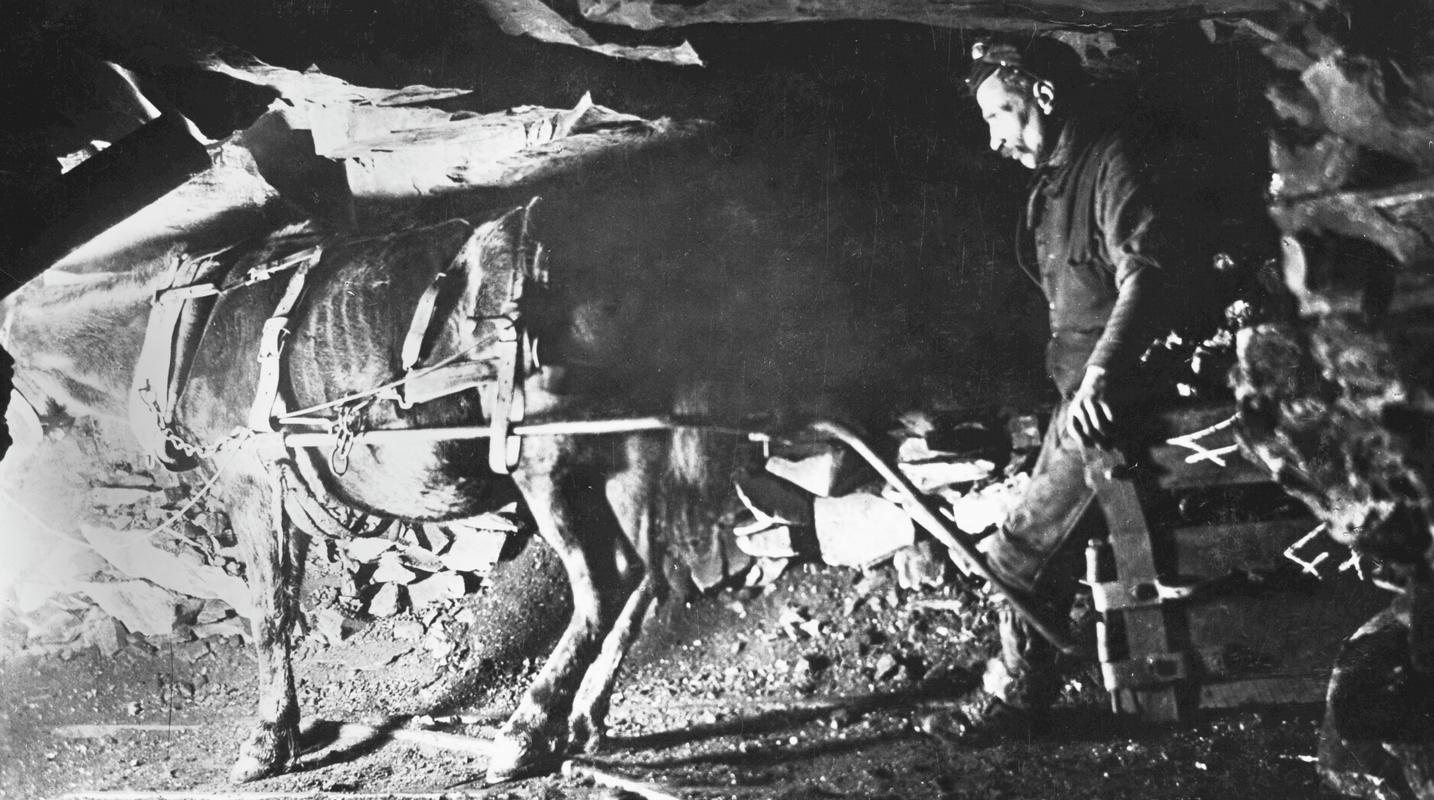 Black and white photograph of collier tipping curling box of coal into tram within a white frame with title in white letters in lower l/h corner of photograph.