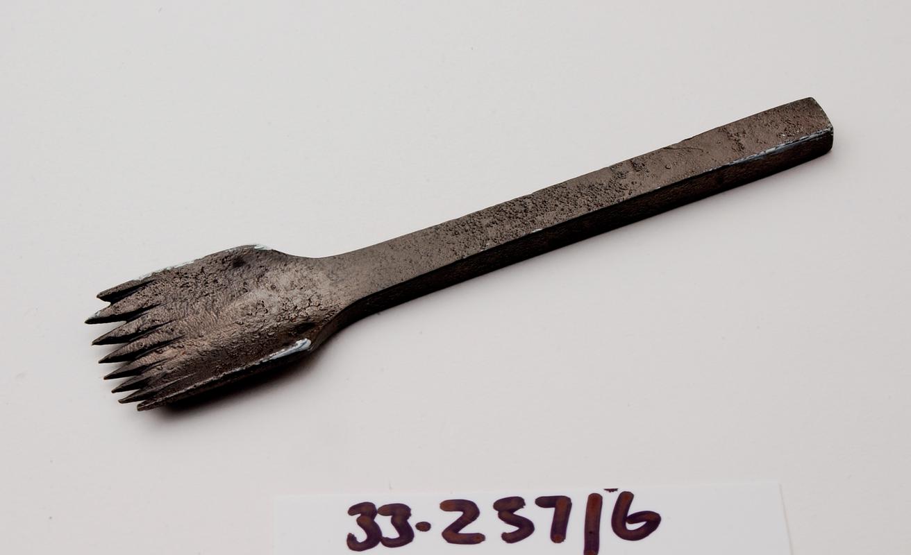 ring of leather worn around the hand with hole for thumb, with dented metal plate of honeycomb design to take the heel of needle when pushing through leather